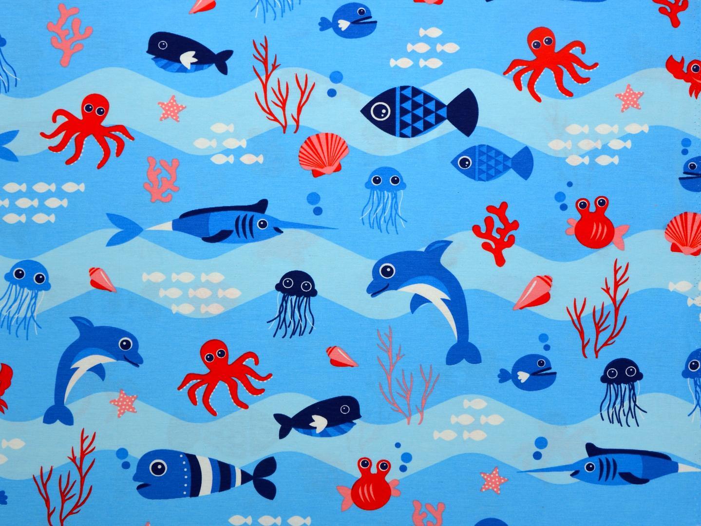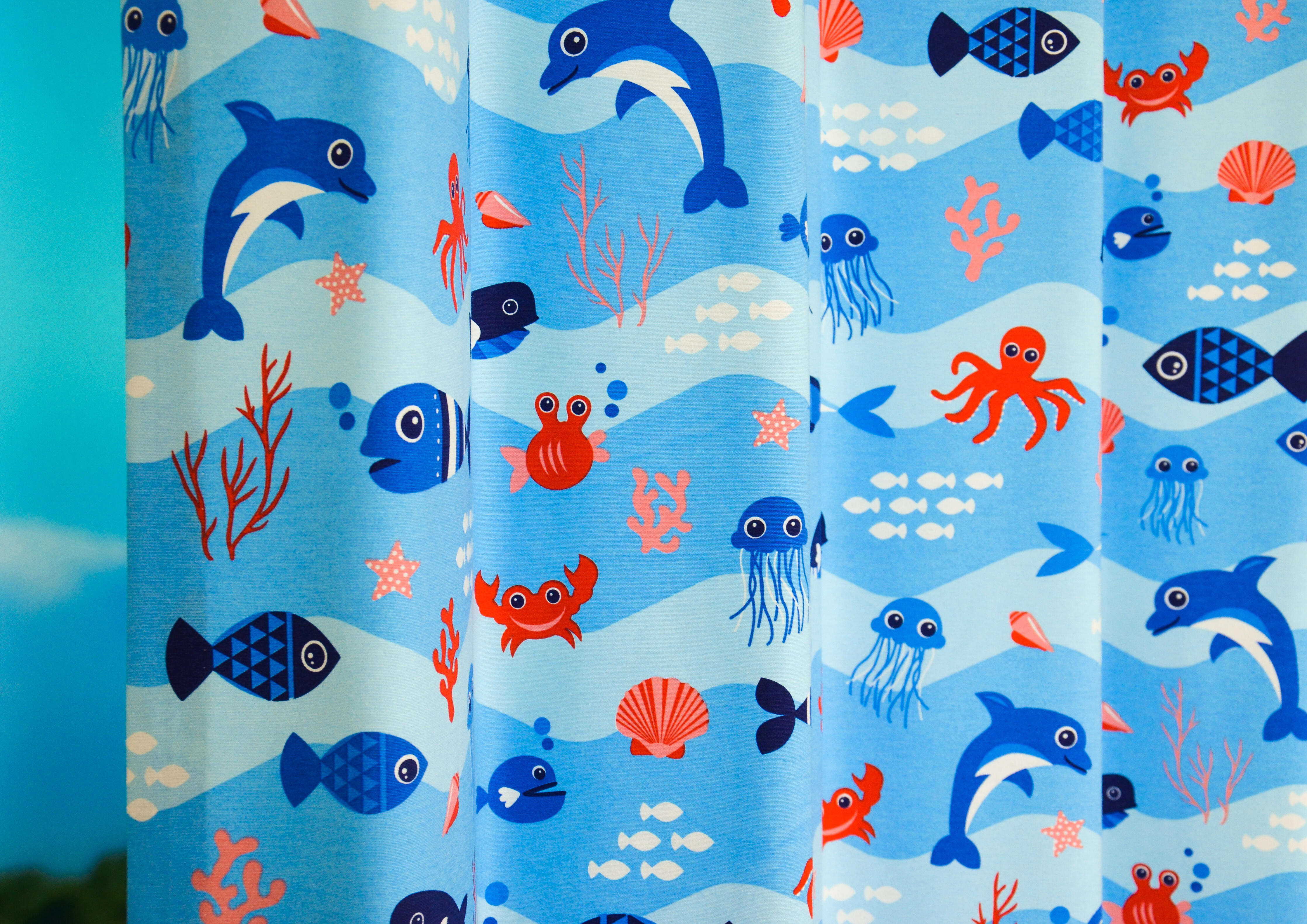 Onderwaterwereld voor je slaapkamerraam, dat is COOL! Van vreemde diepzee vissen tot een vrolijke dolfijn. Meneer inktvis is hier 7 cm groot en allemaal gedrukt op sportieve ietwat geruwde stof. Door de gekozen kleurcombinatie zowel geschikt voor de jongens- als meisjeskamer. Het ‘zee thema’ kan je uitbreiden met leuke accessoires. Een bijpassend kussen van dezelfde stof kan óók. Voor verduistering graag voeren.