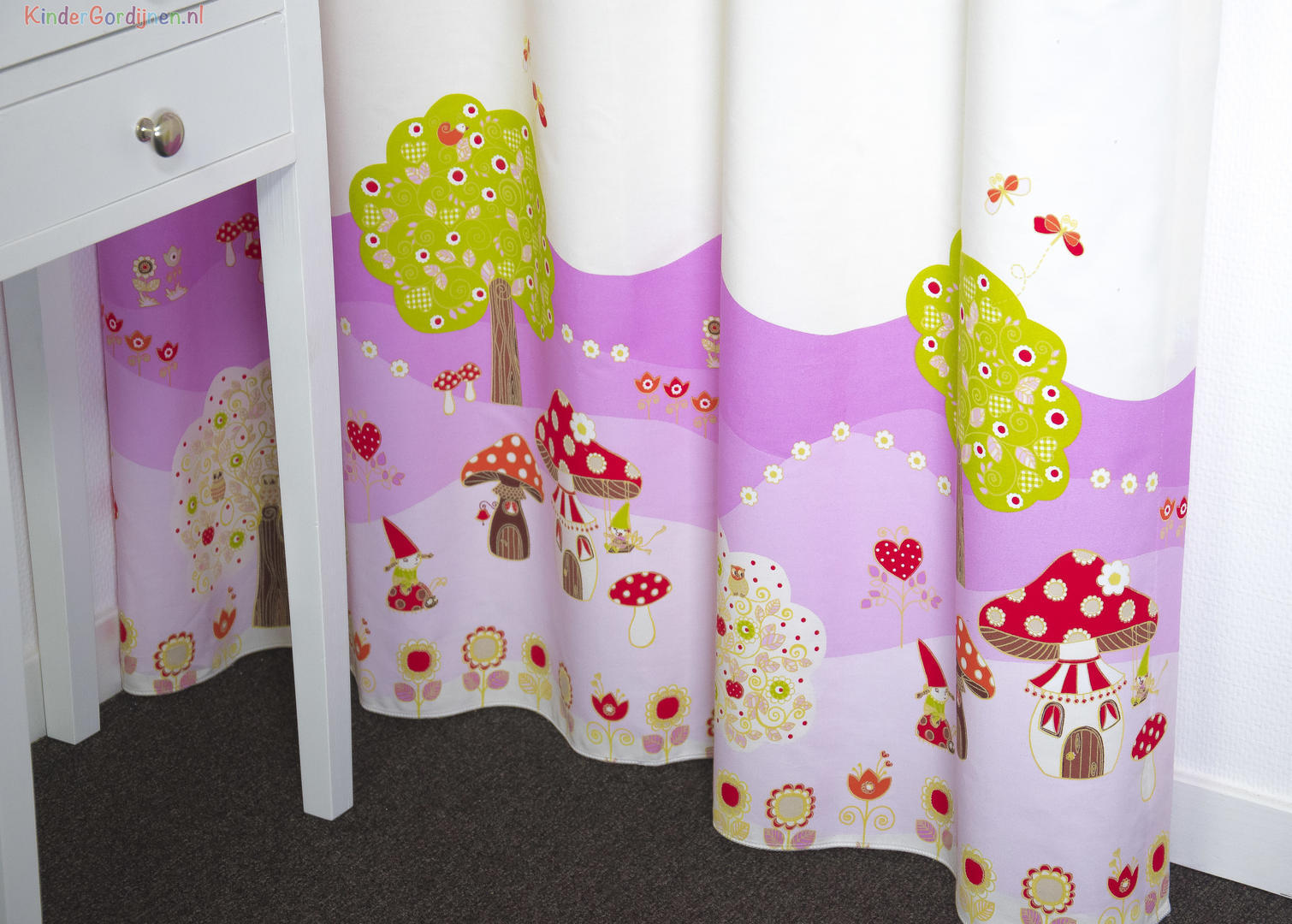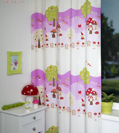 Een gordijn uit de sprookjeswereld, héérlijk toch?! Kinderstof vol fantasie en kleur! De paddenstoel met witte stippen, bloemen en kabouters zijn gedrukt op soepelvallende, glad geweven katoen. Leverbaar in 2 kleurstellingen. Het patroon is heel royaal, waardoor het gordijn uitstekend tot de grond gemaakt kan worden. De boom is zelfs 35 cm groot! Maak jij van je slaapkamer een echt sprookjesbos? Voor een extra donkermakend effect even laten voeren.