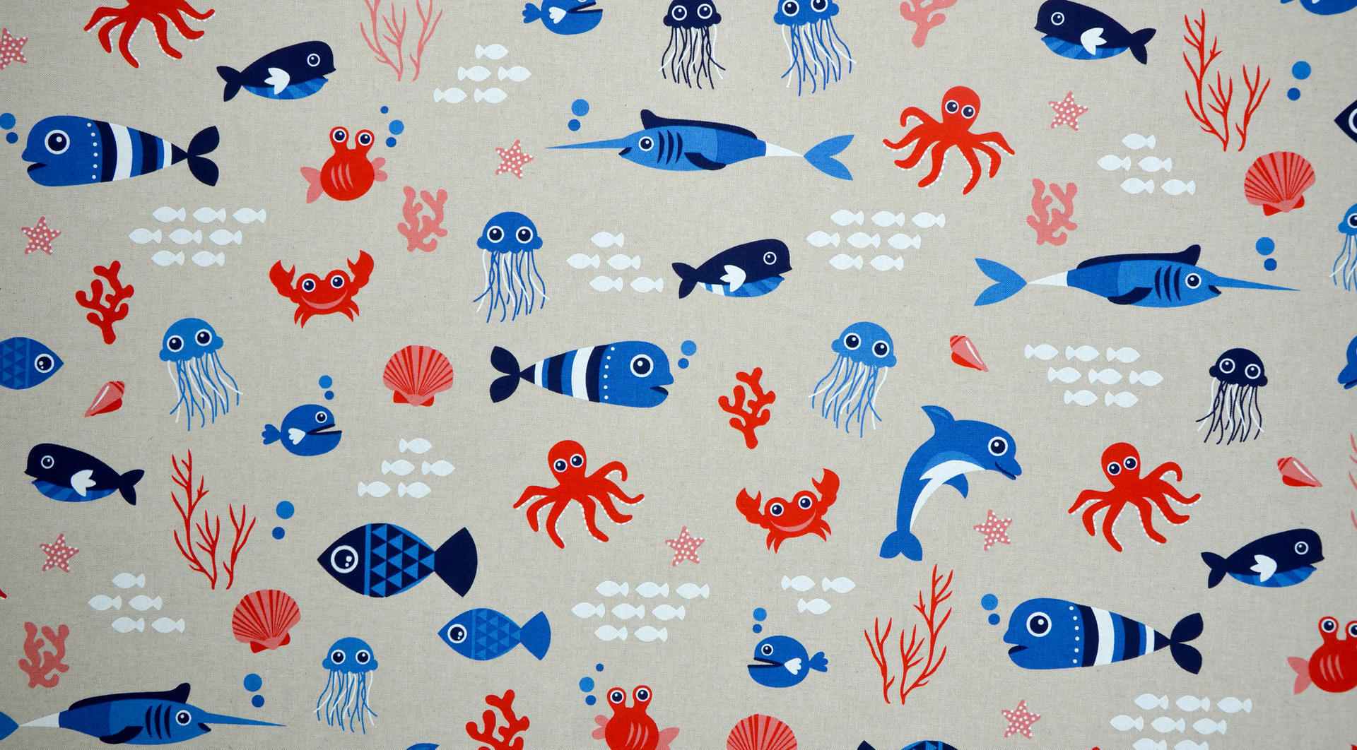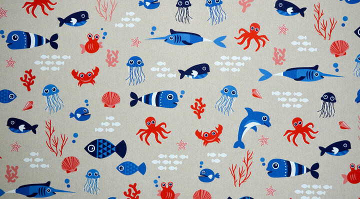 Onderwaterwereld voor je slaapkamerraam, dat is COOL! Van vreemde diepzee vissen tot een vrolijke dolfijn. Meneer inktvis is hier 7 cm groot en allemaal gedrukt op sportieve ietwat geruwde stof. Door de gekozen kleurcombinatie zowel geschikt voor de jongens- als meisjeskamer. Het ‘zee thema’ kan je uitbreiden met leuke accessoires. Een bijpassend kussen van dezelfde stof kan óók. Voor verduistering graag voeren.