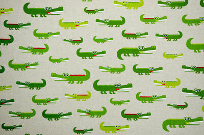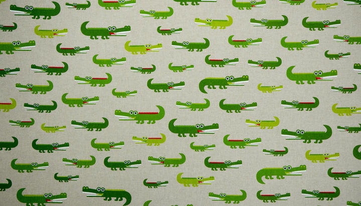 Krrrrr .okodil! Een krokodil heeft iets magisch. Spannend, vervaarlijk en indrukwekkend om te zien. Op dit gordijn met een lachende rij parelwitte tanden. Croco is 10 cm groot en gedrukt op diep donkerbruine, matte stof. Het contrast met de olijfgroene krokodillen geeft een speels effect. Geen wonder dat er verschillende leuke kinderboeken over dit dier geschreven zijn, Croco spreekt tot de verbeelding! Voor verduistering desgewenst voeren.
