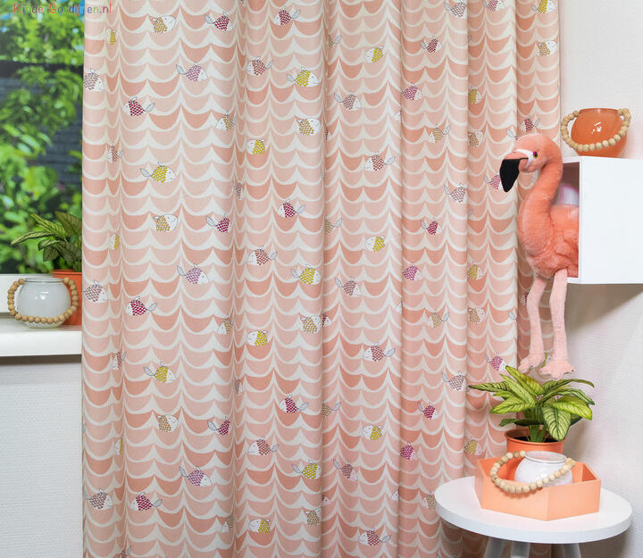 Wat een schitterende kwaliteit gordijnstof! Zien is geloven, zo mooi soepel geweven én maar liefst 280 cm breed! Dat betekent dat het babykamer gordijn meestal naadloos kan worden gemaakt. De schattige visjes print is gedrukt op een heel fijn geribde stof, wat een vlotte sportieve uitstraling geeft. De visjes in de zee zijn op de voorzijde gedrukt, 3 cm groot en leverbaar in 2 verschillende “zee” kleuren. Eigentijds vergrijsd blauw en warm perzik roze. Door het rustig herhalende patroon kan je dit gordijn uitstekend tot de grond laten confectioneren. Wanneer je extra verduistering wenst, graag optie voeren aanvinken in het bestelproces. Kortom, deze fraaie stofserie is een aanwinst binnen onze enorme collectie!