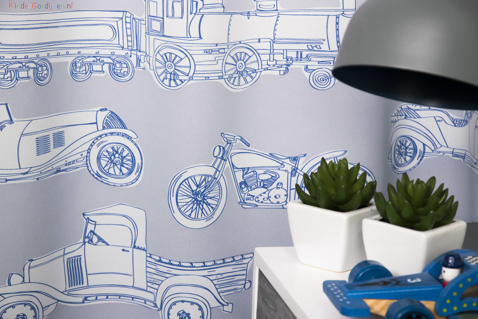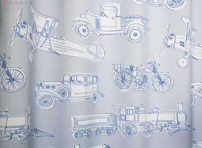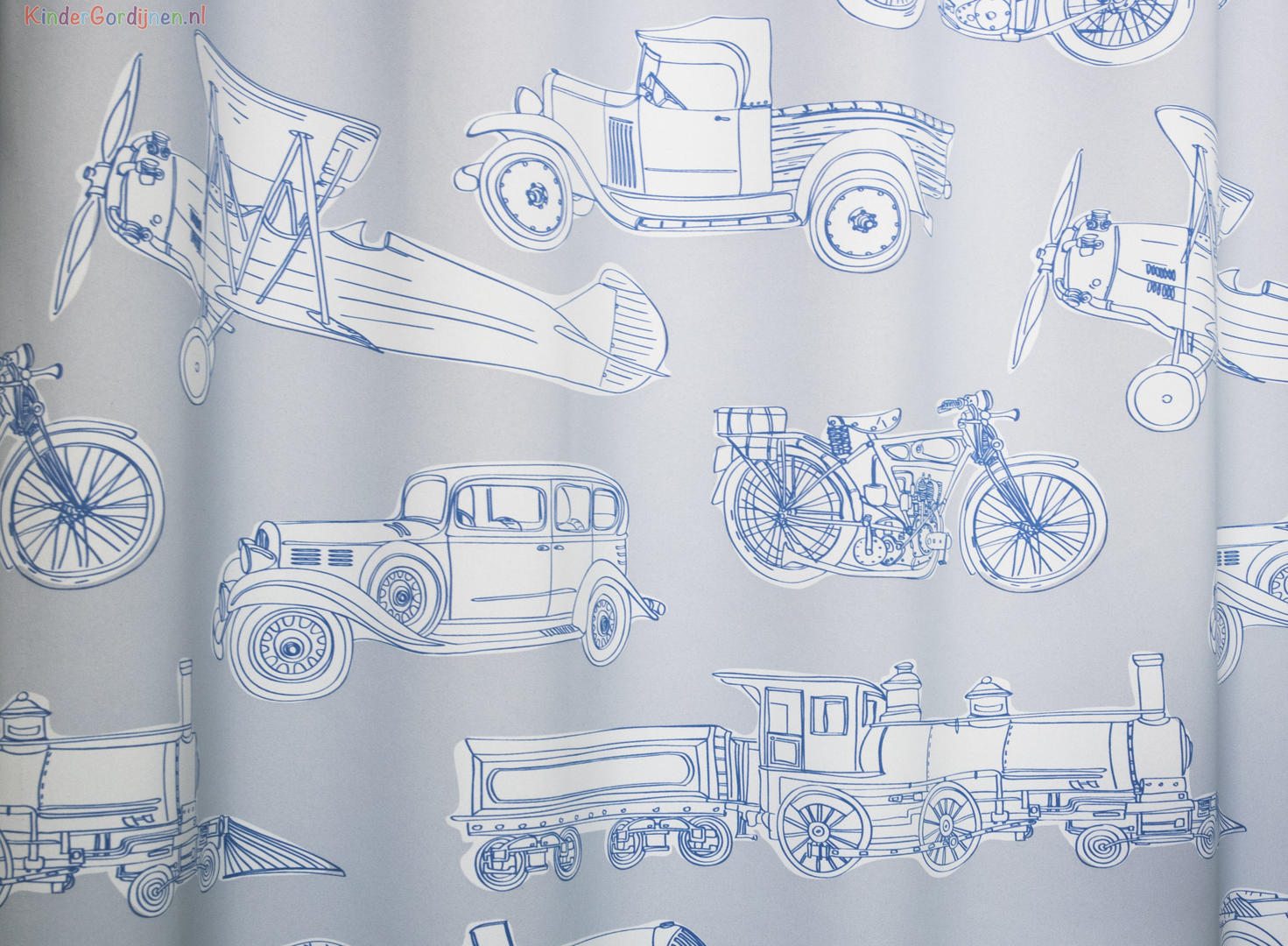 Voertuigen uit vervlogen tijden, maar o… zo tijdloos én stijlvol! Een oldtimer gordijn dat is leuk voor jong én oud! De stof is leverbaar in 2 kleuren: taupe grijs met geel als contrastkleur en fris zilvergrijs, met blauw als accentkleur. De print is op de voorzijde gedrukt op dim out stof, d.w.z. gordijnstof welke zonder extra voering de slaapkamer al aangenaam donker maakt. De afbeeldingen zijn zo’n 25 cm breed en gedrukt op gladde, soepelvallende stof. De achterzijde is egaal gebroken wit. Zo’n klassieke Vintage motor van vóór 1930 of een Biplane Aircraft met open cockpit op jouw kamer, dat is bést bijzonder!