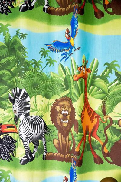 Welk kind wil dat niet? Slapen in het oerwoud; groen en dieren om je heen! Met dit gordijn kan dat eindelijk, want deze vrolijke beesten komen maar wat graag bij jou wonen. De jungle print is aan de voorzijde gedrukt op de glad geweven, matte stof. Het patroon is lekker royaal, waardoor je het gordijn fraai tot de grond kunt laten confectioneren. Wanneer je graag donker slaapt, kan je het gordijn extra voeren. Dit is tevens goed voor het kleurbehoud. Welkom in je toekomstige droom slaapkamer!
