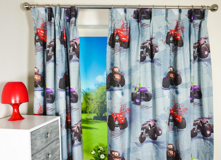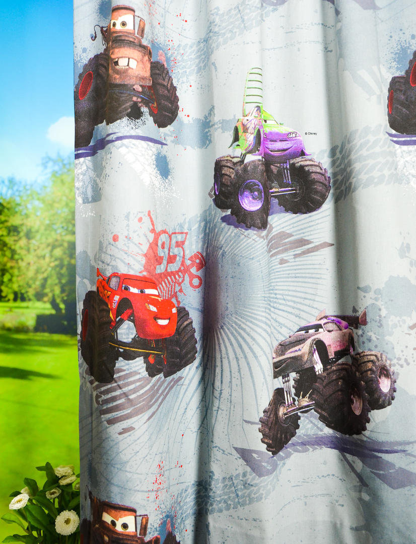 Verduisterend kindergordijn met o.a. monstertruck McQueen van Disney Cars. Een stoer jongensgordijn voor de kinderkamer van jonge autoliefhebbers!