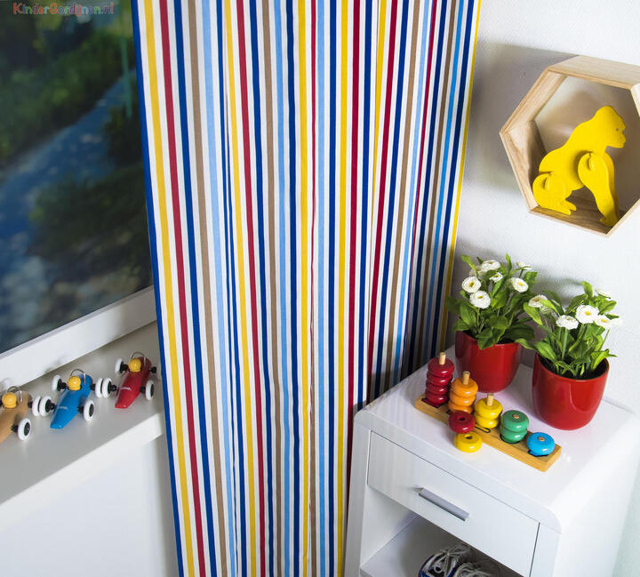 De strakke lijnen van dit kindergordijn zorgen voor een kleurrijke en tegelijkertijd stijlvolle uitstraling. Het gordijn heeft een witte ondergrond en lijnen in de kleuren lichtblauw en donkerblauw, rood, okergeel en bruin. Leuk om te combineren in de jongenskamer of meisjeskamer met kleuren in deze tinten of met een witte kamer. Het kan lang mee, want het is geschikt voor jongens en meisjes van alle leeftijden. Dit 100% katoenen kindergordijn kan indien gewenst verduisterend worden geleverd.