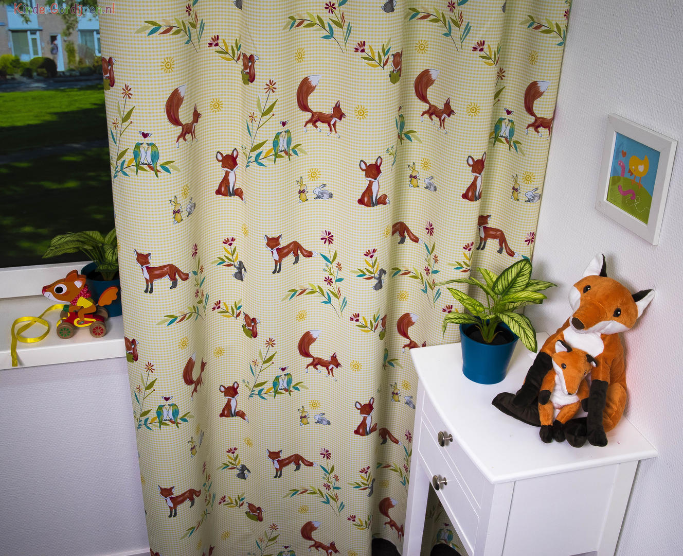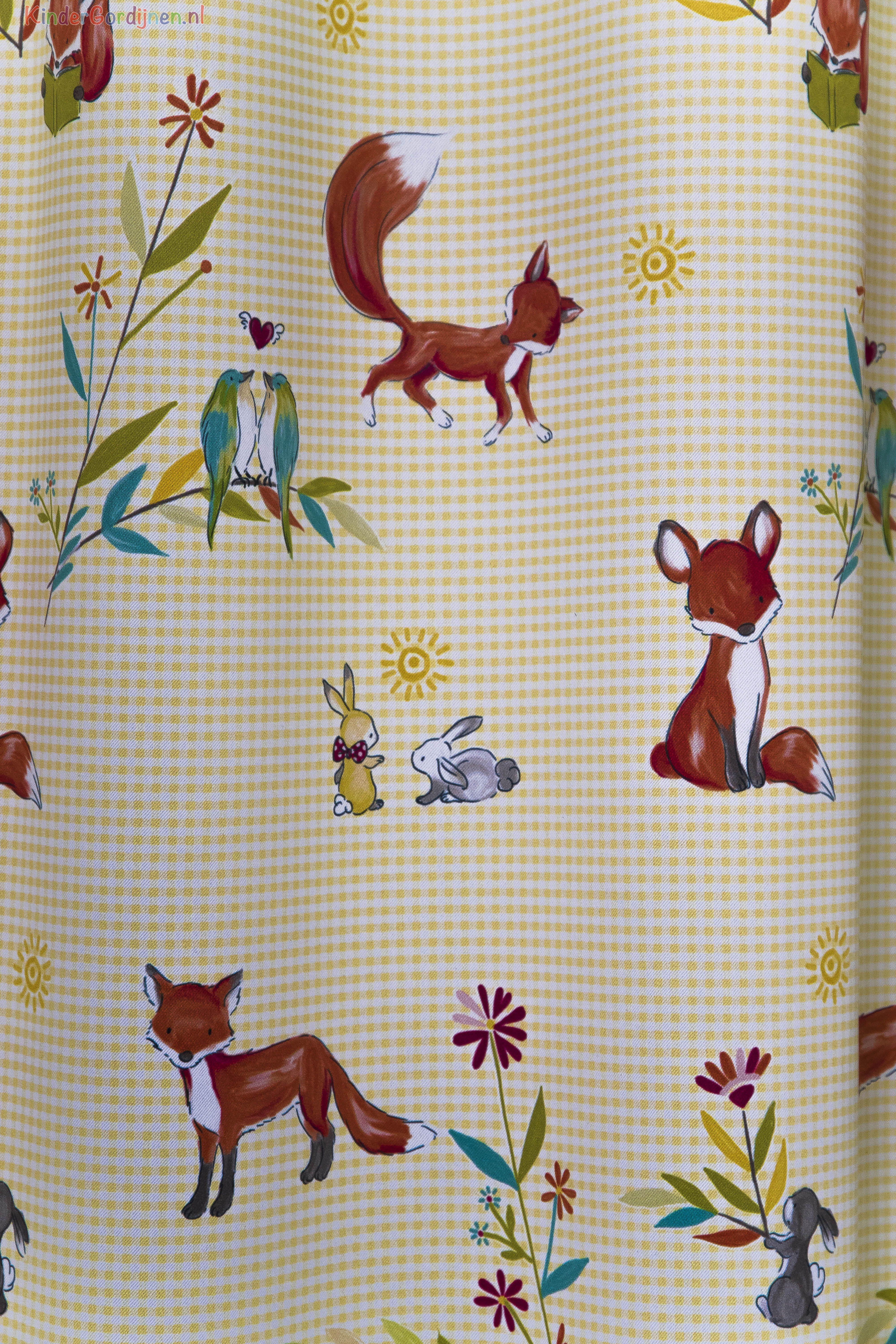 Dat is handig, een decoratief kindergordijn wat direct de slaapkamer behoorlijk donker maakt! Door de dim out laag die de stof al heeft, hoef je eigenlijk niet meer extra te voeren. Het voordeel is dat het gordijn nu heel soepel valt. De stof is leverbaar in 2 kleuren : met een fris geel achtergrond ruitje en een licht turquoise ruitje. Het vrolijke vosje is met de hoge staart 11 cm groot, de verliefde vogeltjes 5 x 8 cm. De achterzijde van de stof is neutraal gebroken wit. Passend in een jongens- en meisjesslaapkamer, dus met dit gordijn zit je altijd goed! Mogen de bosdieren bij jou komen wonen?