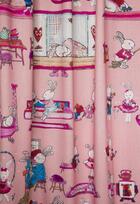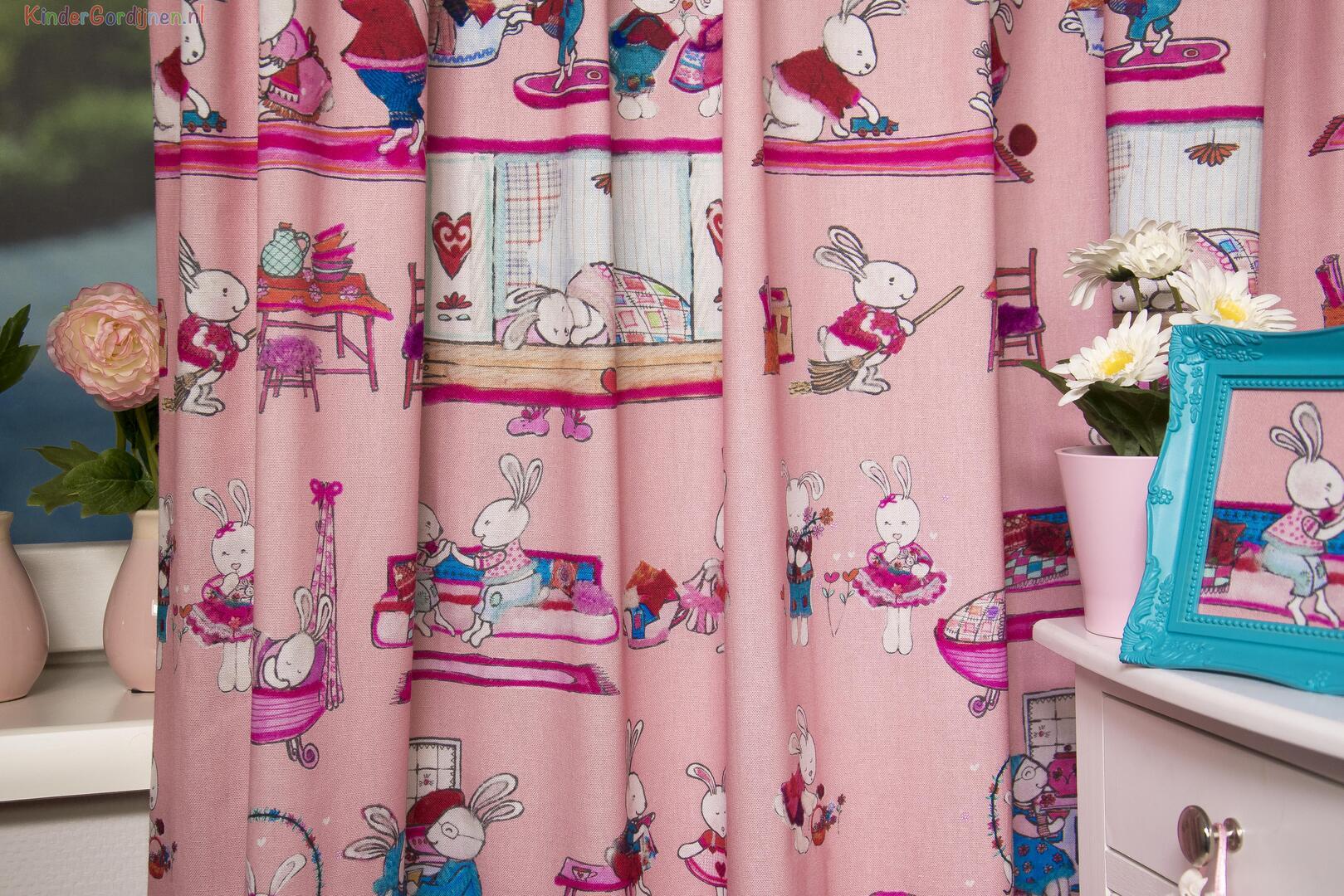 Een súper schattig gordijn voor de kinderkamer, ontworpen door Hanneke de Jager. Deze beeldend kunstenares is schrijver en tevens illustrator van een aantal bijzonder leuke kinderboeken. Zij omschrijft haar stijl als: “Fris, kleurrijk, levendig, speels en zonnig.” Door gebruik van verschillende materialen zoals stofjes van de markt, knopen en gebreide truien, geeft zij haar illustraties iets unieks. In het patroon zie je namelijk de weergave van die leuke details van de verschillende texturen. Zo heeft het slapende konijntje een patchwork lakentje, afgewerkt met een bijna aaibaar wollen draadje. Het stylen van de kinderkamer is geweldig leuk om te doen en hoe bijzonder is het om een kindergordijn van een échte ontwerpster te hebben! Dit kindergordijn is gedrukt op pastel roze, matte en soepel vallende stof. De print is op de voorzijde gedrukt en als je goed kijkt zie je die kenmerkende ‘Hanneke’ details. Zij tekent hele mooie kinderboeken waarin haar figuren haast tot leven komen. Dat zie je ook bij deze vrolijke konijnenfamilie. Het lachende konijnen-meisje is 11 cm groot en het wiegje 11 x 15 cm. (b x h) Mag jouw eigen meisje op een bijzondere manier naar dromenland? Geef je eigen knuffel dan een fantasierijk Hanneke de Jager kindergordijn!