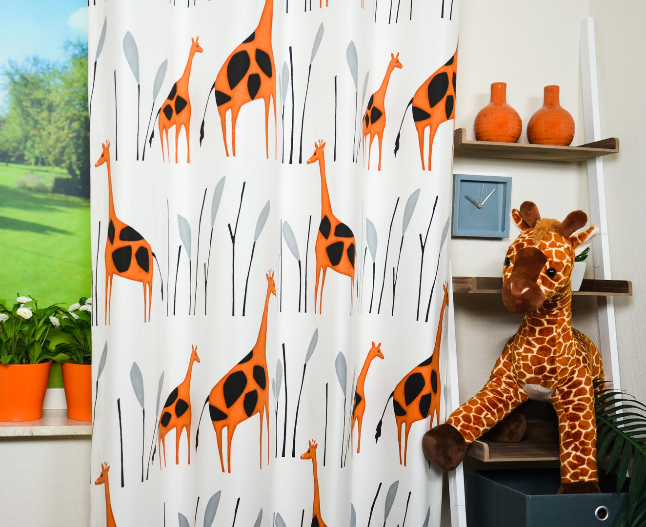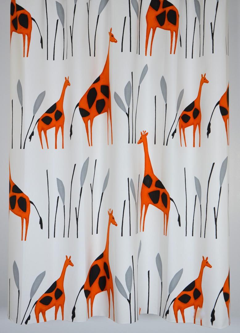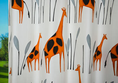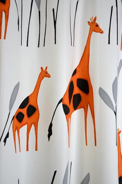 Fraai, soepel geweven gordijn dat uiterst stijlvol is door zijn eenvoud. De giraffes zijn aan de voorzijde gedrukt in een warme roestkleur. Ze hebben verschillende kleurtonen, waardoor de afbeelding zowaar geschilderd lijkt. De ondergrond laat de matte en dichte weefstructuur zien en is wolwit van kleur. De sierlijke giraffes zijn maar liefst 35 cm groot! De grafische bomen zijn zwart met grijs. Door het royale patroon kan dit gordijn uitstekend voor grote raamoppervlaktes. Je kan dit gordijn stoer combineren met een zwart rolgordijn of evt. verduisterend laten voeren. Een perfecte keus voor een kinderkamer die tijdloos mag worden!