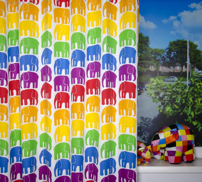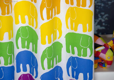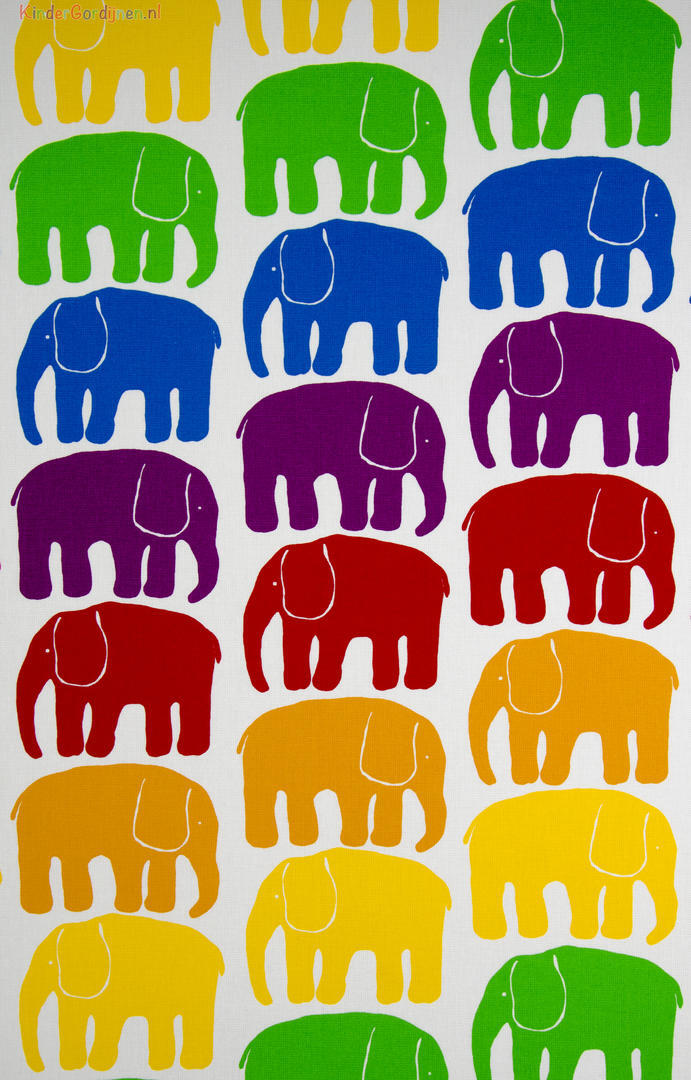Elefantti olifant, hier als kunstzinnig dier. Wat een plezier om zo’n krachtige vorm gestileerd op je gordijn terug te zien. De Olifantjes zijn 10 cm groot en gedrukt op matte, luchtig geweven stof. Het gordijn is leverbaar in 2 kleurcombinaties, te weten warm-wit met fris middengrijs en multicolor gedrukt op dezelfde warm-witte ondergrond. Daardoor passend voor de jongens- en meisjesslaapkamer en geschikt als je niet weet “wat het gaat worden”. Het leuke van dit olifantengordijn is dat de repeterende vorm best strak aandoet en toch met een knipoog naar de kinderkamer. Kortom een gordijn voor diegene die van een rustige basis houdt en niet direct in een effen oplossing wil vallen. Voor extra verduistering graag even laten voeren.