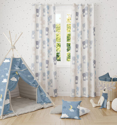 Vrolijk kijk ik de wereld in!, Ja ook jij kleine beer! Dit gordijn is schattig voor de kleine van jou, door de kleine, tuimelende troetelbeer. De 12 cm grote beertjes kijken helder en eigenwijs de slaapkamer in. Door de herhaling van vorm, blijft het gordijn rustig en toch speels. De stof is leverbaar in 3 verschillende kleuren. Voor verduistering desgewenst voeren, een verschil van dag en nacht!💤