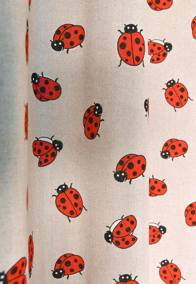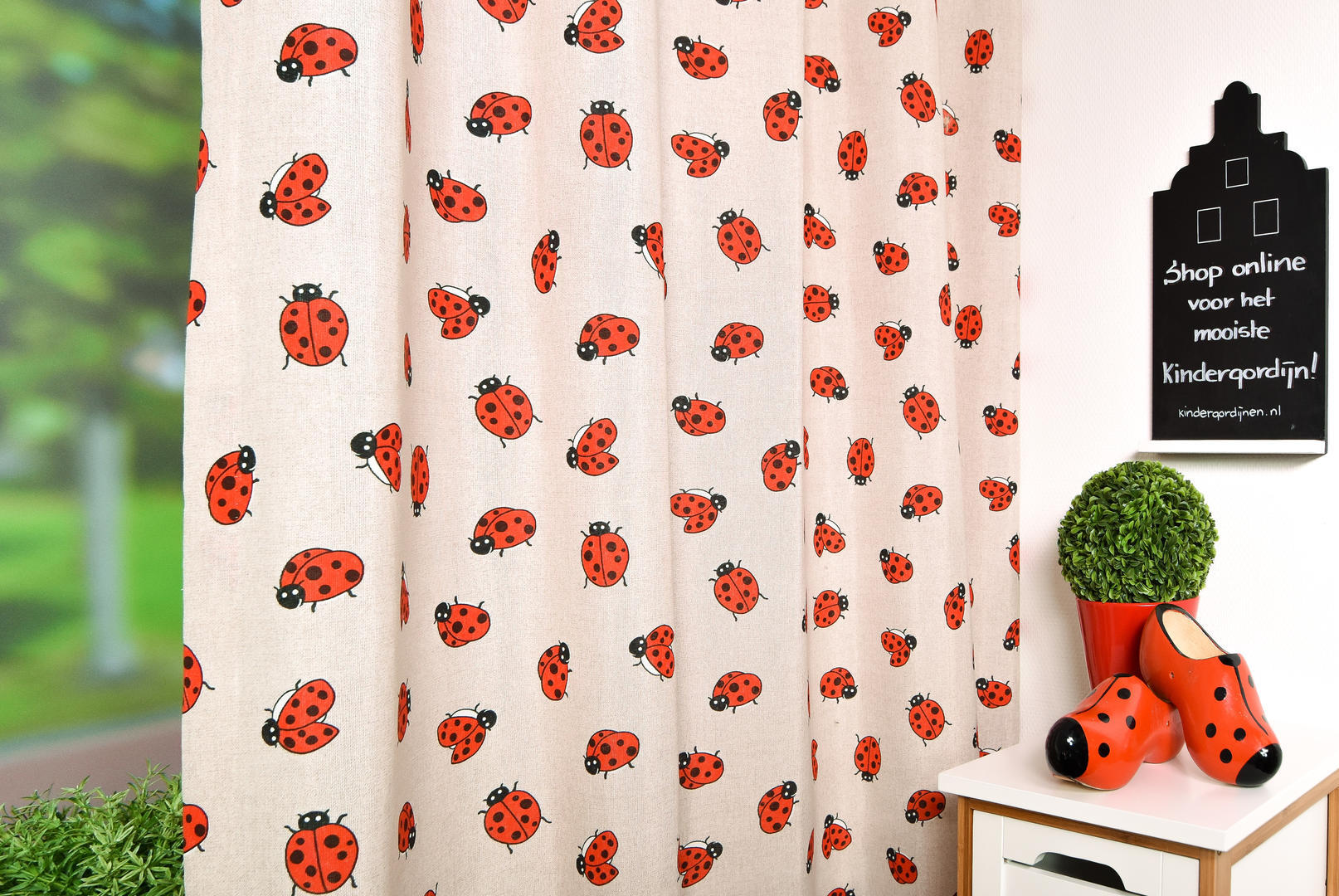 LIEF, LIEF, LIEVEbeestje…. Oeps, lieveheersbeestje! Schattig toch om daar een gordijn van te hebben?! De lieveheersbeestjes zijn gedrukt op kamerhoge, stevige stof en zijn zo’n 5 cm groot. Licht geribd van structuur en daardoor een vlotte uitstraling. De ondergrond is warm grijs en daardoor makkelijk te combineren met andere kleuren. Klei en leem tinten, samen met sloophout is hierbij altijd perfect! Mogen deze lieve diertjes bij jou komen wonen?