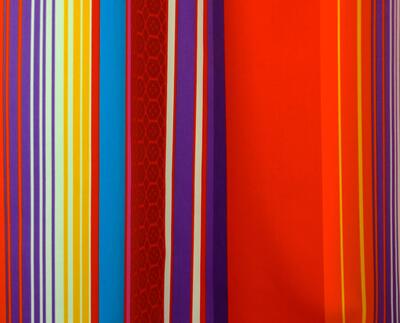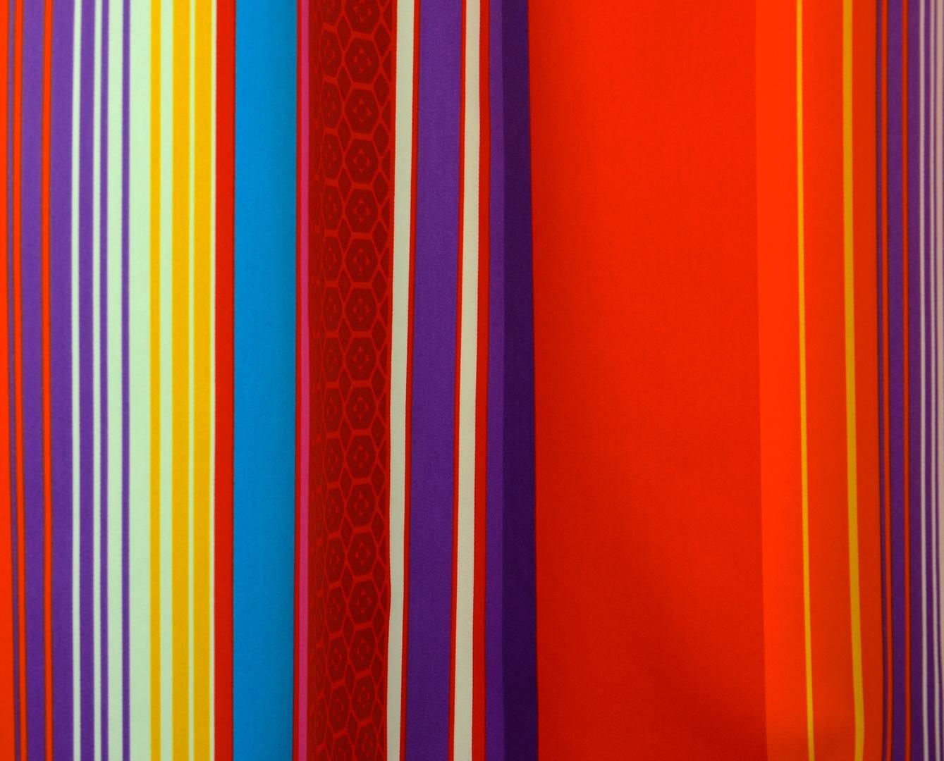 Frisse streepprint gecombineerd met fijne motiefjes, op een soepel vallende satijnen gordijnstof. De print is aan de achterzijde licht zichtbaar.