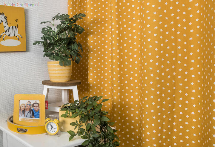 Deze gordijnstof met de naam Ochre stars is gemaakt van de beste materialen waardoor het gordijn mooi in de plooi valt.