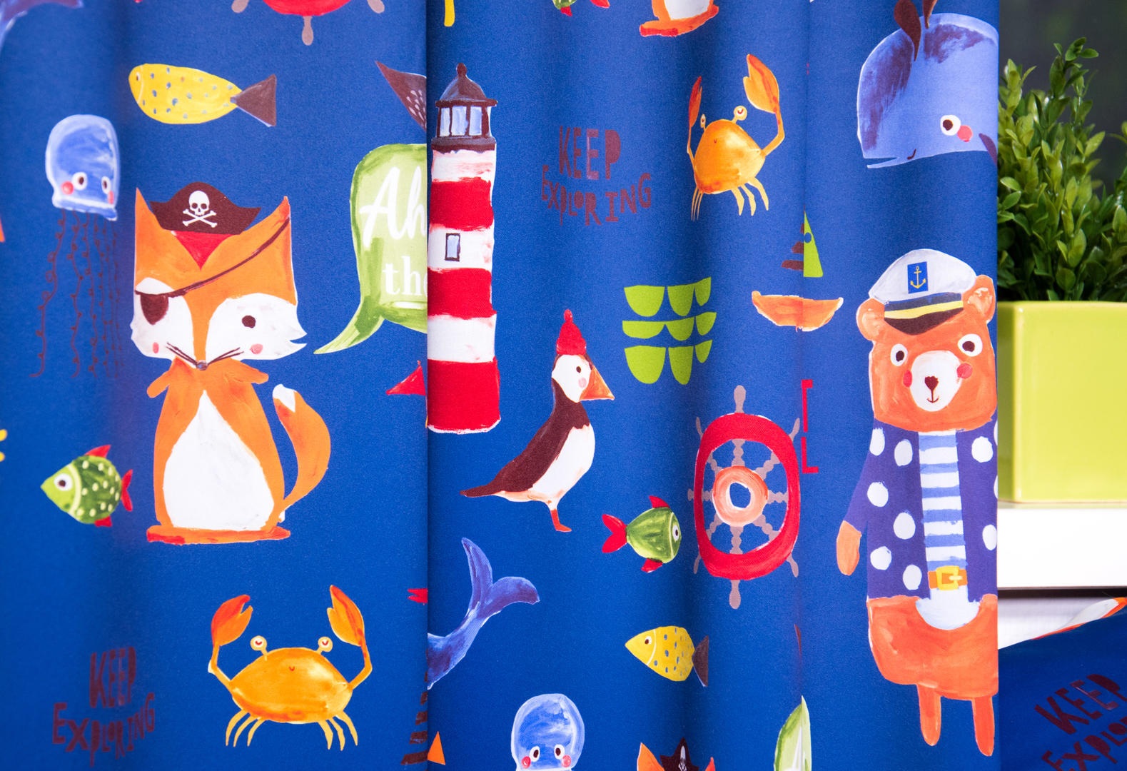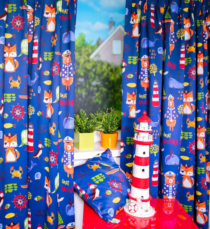 Dierengordijn dat voor de kleine vent lekker stoer is. Er is zoveel om naar te kijken en je fantasie de vrije loop te laten. Kapitein beer is 22 cm groot en hij komt piraat slimme vos regelmatig tegen. Beide willen jou graag naar dromenland begeleiden op hun zeewaardig jacht. Deze dim out stof maakt je slaapkamer direct aangenaam donker, zonder extra voering. Dat is voor een plezierige nachtrust extra fijn! De stof valt soepel en de achterzijde is egaal gebroken wit. Maak jij het zee- of strandthema met leuke accessoires compleet?