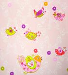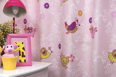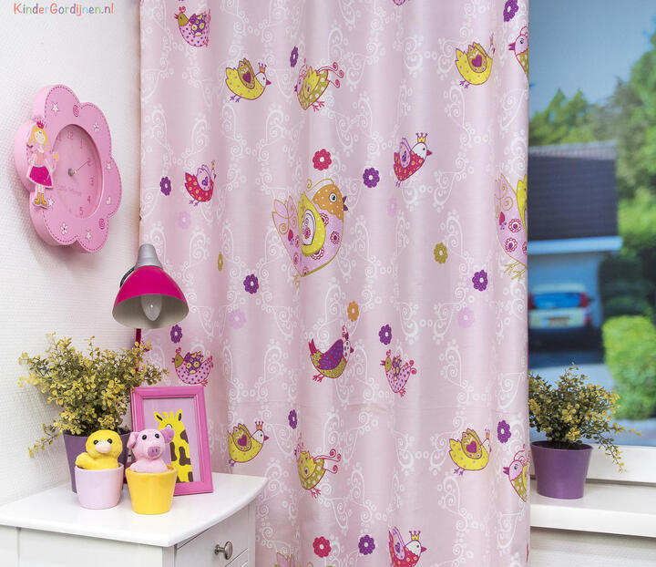 Levendig kindergordijn met een vrolijk motief van rondfladderende vogeltjes. Met deze gordijnstof in de kinderkamer wordt uw dochtertje iedere ochtend vrolijk wakker!