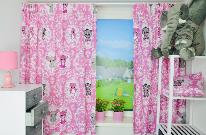 Schattige kraaloogjes kijken naar je vanaf dit gordijn. De troetelige diertjes zijn gedrukt op satijnzachte, soepelvallende stof. De roze ondergrondkleur is fraai poederig gekozen, waardoor het geheel extra lieflijk wordt! De knuffelbeer is maar liefst 15 cm groot en de ornamenten vorm om de dieren heen is zelfs 20 x 30 cm. Door dit royale patroon is dit gordijn heel geschikt voor grote raamoppervlaktes en confectie tot de grond. Mag Ollie Olifant met zijn twinkeloogjes bij jou komen wonen?