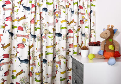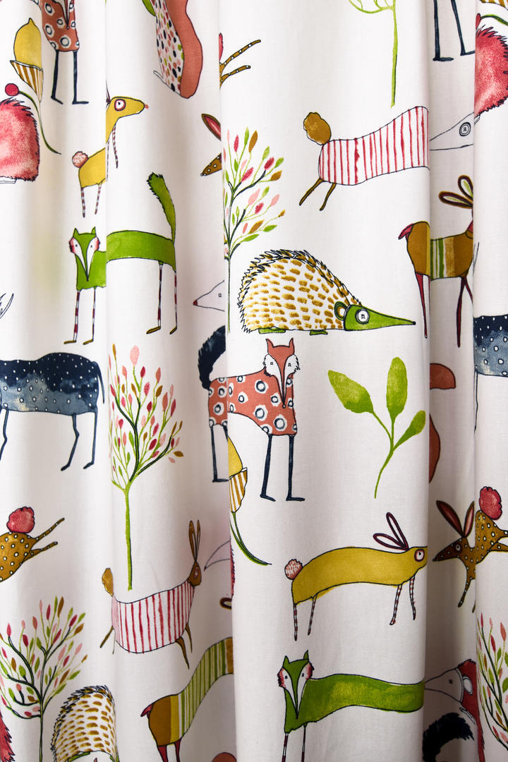 Fraai gordijn voor de meisjes- en jongensslaapkamer. Kunstzinnig getekende bosdieren komen gezellig bij je ‘buurten’ en maken de kamer direct gezellig & sfeervol. De afbeeldingen zijn gedrukt op dicht geweven, matte katoen. De ondergrondkleur is warm wit en de stof leverbaar in 3 verschillende kleuren. Houd je van schattig, maar niet al te zoetsappig, dan is dit gordijn perfect! Voor extra verduistering even voeren aanvinken in het bestelproces.