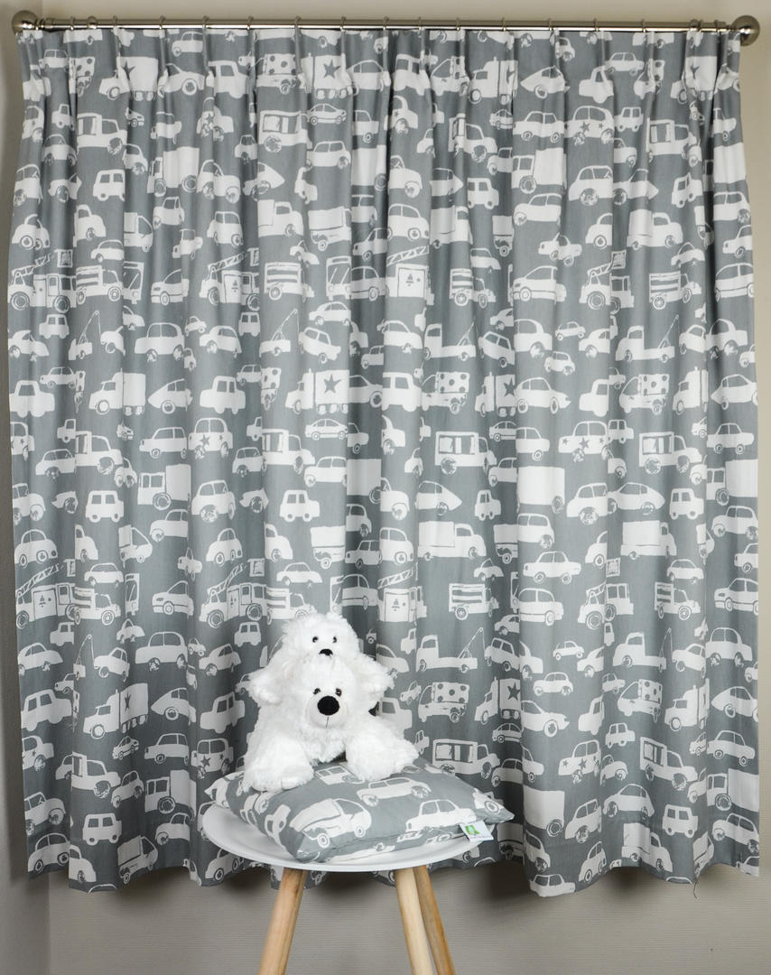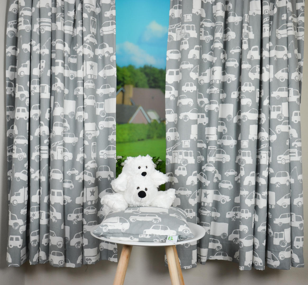 Jongensgordijn met het geliefde autothema op een stijlvolle manier uitgevoerd. De autootjes zijn gedrukt in ietwat verpoederde tinten op fraaie, matte en dicht geweven katoen. De stof is leverbaar in 4 verschillende kleurcombinaties, van vrolijk tot rustig & tijdloos. De klassieke raceauto is hier b.v.16 x 7 cm groot. Auto’s en oldtimers vervelen nooit! Voor extra verduistering graag even laten voeren.