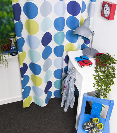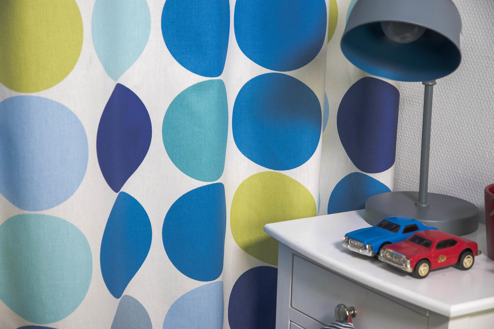 Met dit kindergordijn tover je de ruimte in een handomdraai om tot een bonte en gezellige kinderkamer! Het gordijn heeft verschillende rijk gekleurde 'spots' De grote stippen van 15 cm zijn in een vast patroon gedrukt op een witte ondergrond. Een gordijn om vrolijk van te worden! De gordijnstof is van 100% katoen en kan indien gewenst (geheel) verduisterend en isolerend worden besteld, een verschil van dag en nacht!