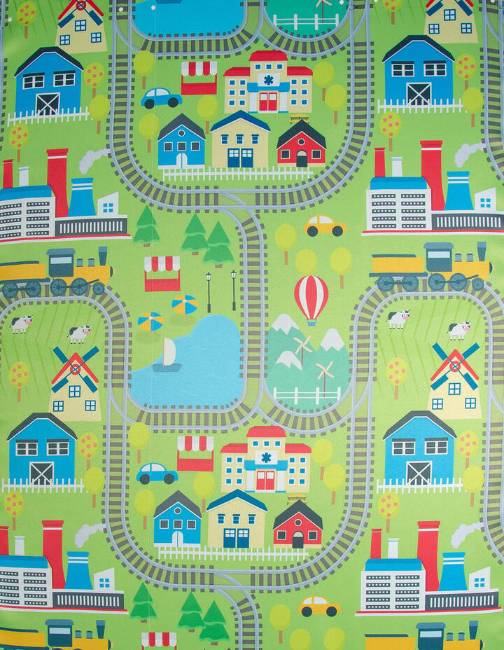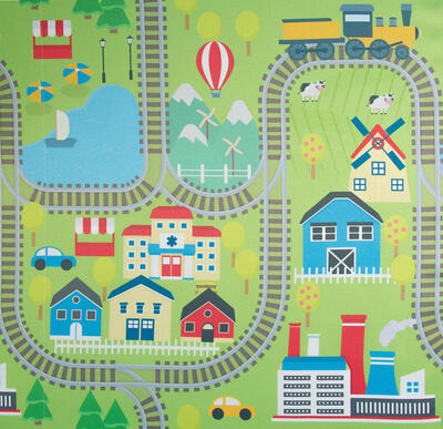 Dat geeft een ruimtelijk effect! Een eindeloze spoorbaan afgebeeld op je gordijn. Langs velden en dorpjes om in- en uit te stappen, wanneer jij dat graag wil. Wat dit gordijn extra speciaal maakt is zijn dim out effect. Dat betekent dat zonder extra voering de slaapkamer aangenaam donker wordt. De stof valt soepel en is aan de achterzijde egaal gebroken wit van kleur. De huisjes zijn +/- 8 cm groot en gedrukt op de frisse, grasgroene stof. Reis jij mee met deze avontuurlijke trein?