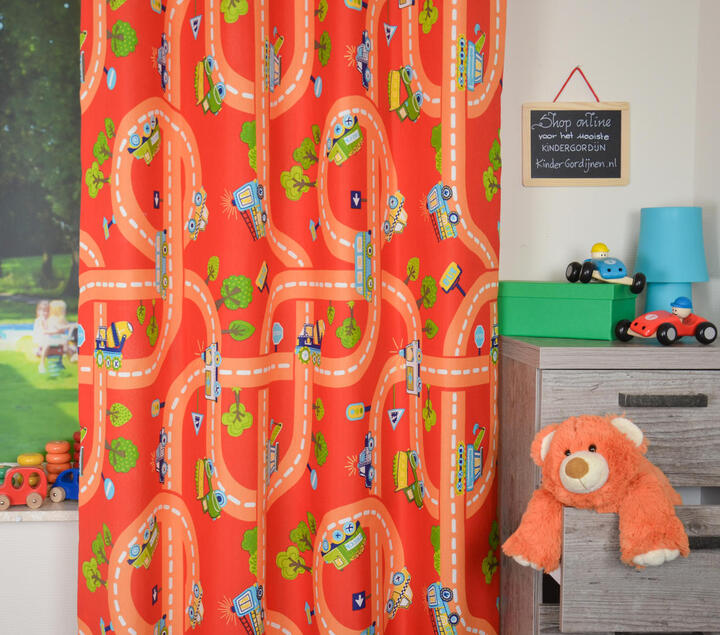 Dat is leuk! Een autoroute op je gordijn! Van brandweerauto tot cementwagen rijdt er op de weg. Jij mag in jouw slaapkamer de route bepalen. De auto’s zijn +/- 10 x 8 cm en de stof leverbaar in 2 frisse, eigentijdse kleuren. Door het royale patroon kan dit gordijn uitstekend voor grotere raamoppervlaktes. Tevens kamerhoog, waardoor je voor hetzelfde geld de stof tot de grond geconfectioneerd krijgt. Welke jonge vent wordt hier nu niet blij van? Voor verduistering even laten voeren.