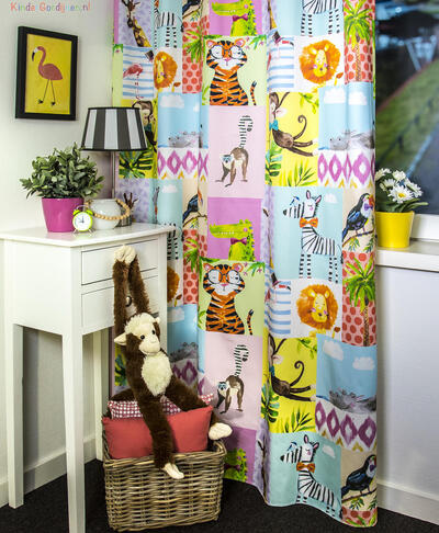 De Sabana is een kleurrijk kindergordijn met een prachtige print van vrolijke jungledieren. Spelen in de kinderkamer is wel heel gezellig met deze aandoenlijke leeuwen, zebra’s, giraffes, olifanten en neushoorns op de gordijnen. Het Tisafari gordijn is verkrijgbaar in drie warme kleurencombinaties.