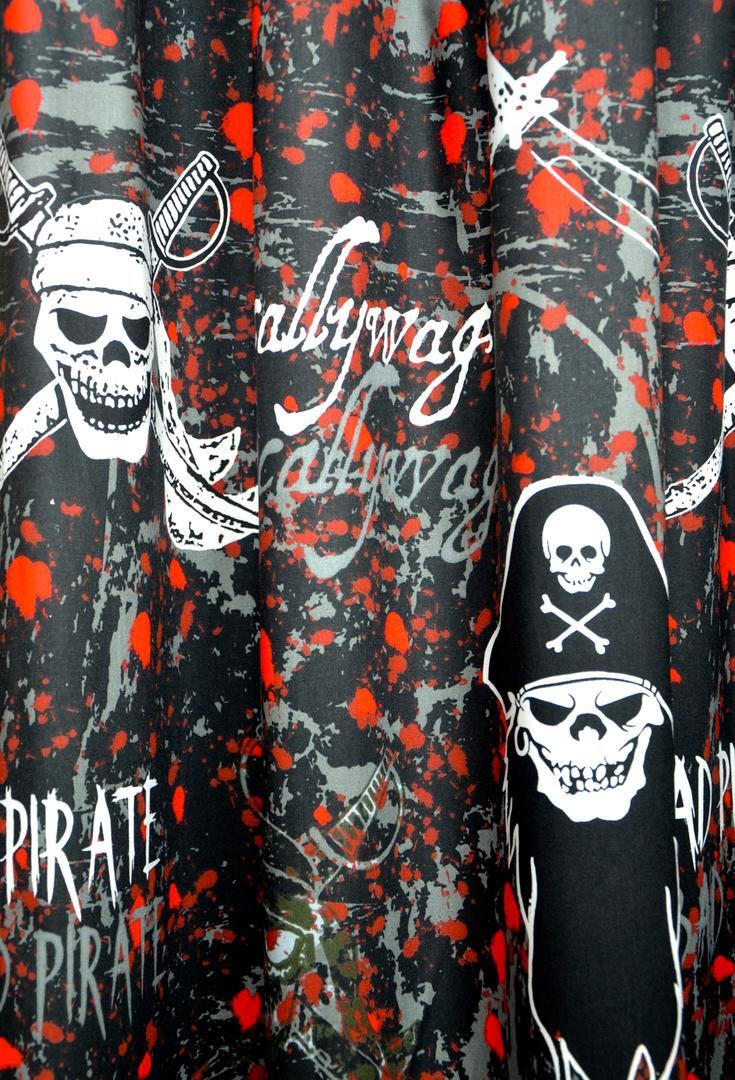 Bloedstollend piratengordijn voor stoere jongens die nergens bang voor zijn! Het ScallyWay gordijn heeft een spannende kleurencombinatie van zwart en rood. Pistolen, zwaarden en Jolly Rogers zijn allemaal terug te vinden op dit kindergordijn!