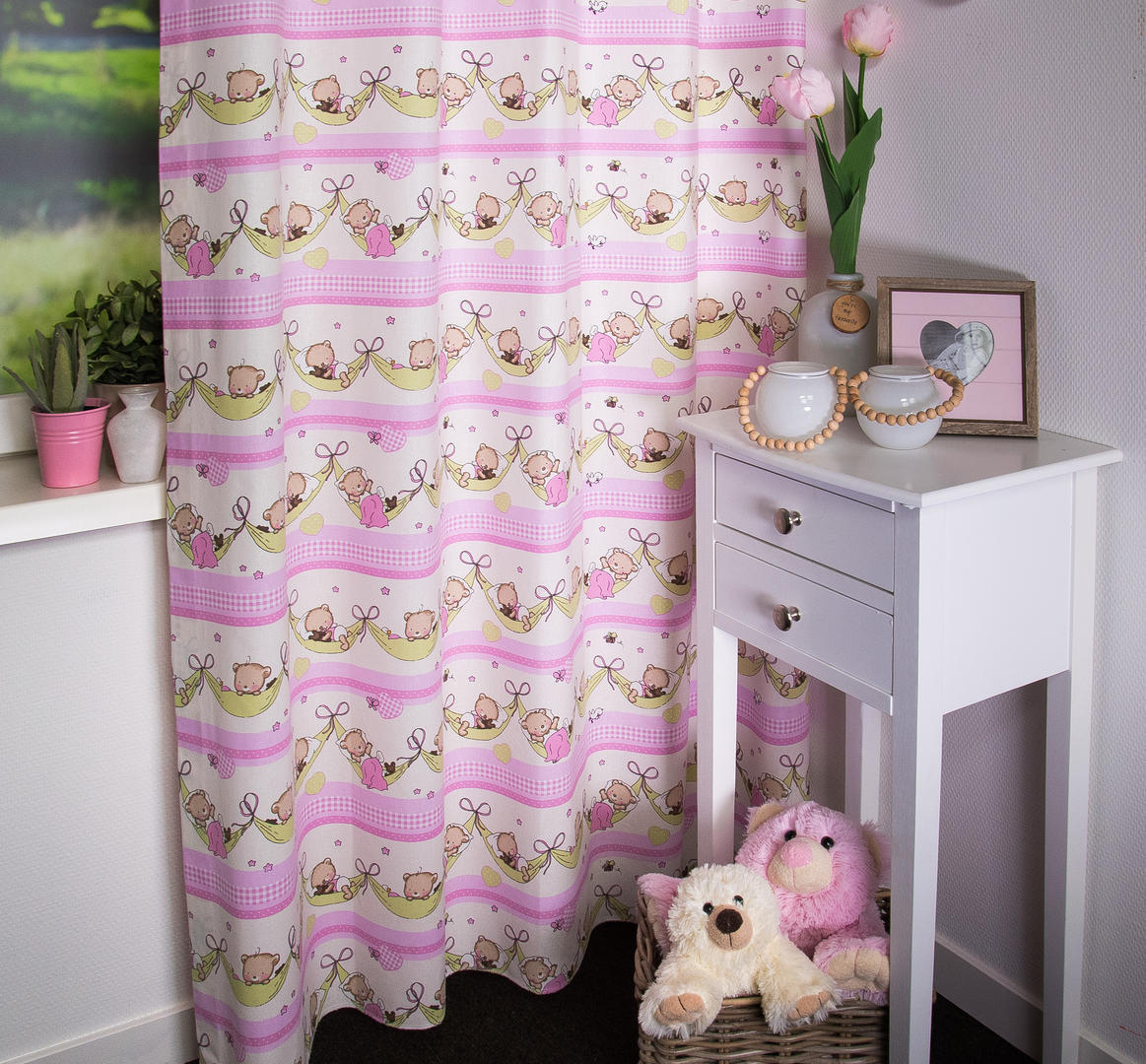 Aandoenlijk babygordijn met zachte knuffelberen die heerlijk wegdommelen of net weer terugkomen uit dromenland. Het gordijn is verkrijgbaar in twee uitvoeringen. Twijfelt u tussen twee kleuren? Vraag een knipstaaltje aan. Zo weet u precies wat u in huis haalt!