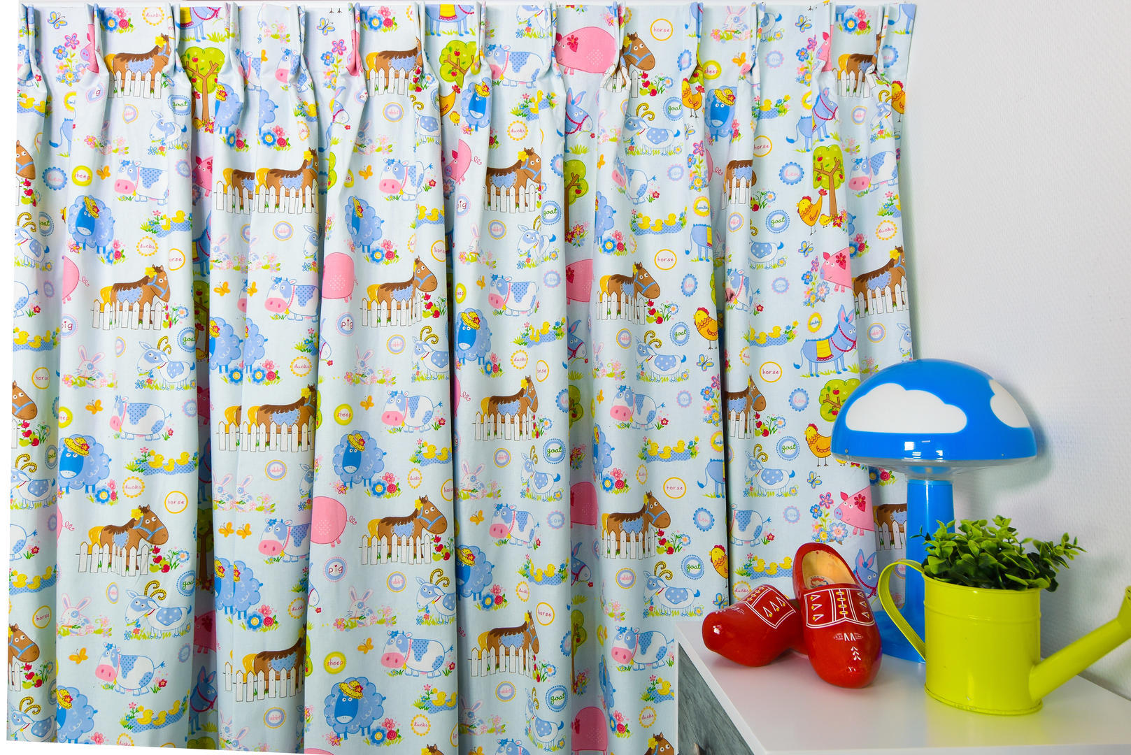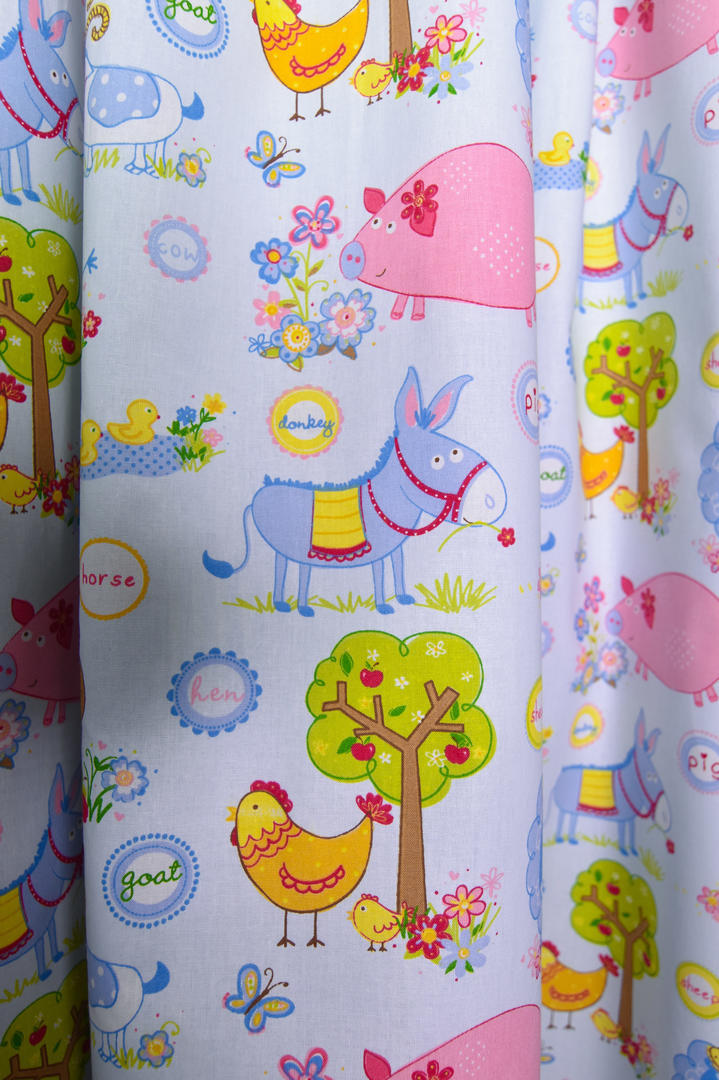 Op zoek naar een vrolijk gordijn voor de babykamer? Zoom dan in en geniet van alle gezellige boerderijdieren! Zo leuk voor de kleine dat er zoveel te zien is, van lieve eendenkuikens tot knabbelend geitje. De stof is leverbaar in 3 verschillende kleur paletten en daardoor geschikt voor de jongens- en meisjes slaapkamer. De kleur en dierenprint is aan de voorzijde gedrukt op de matte, fijn geweven stof. Dit gordijn past perfect bij een helder witte muur of een hele zachte pasteltint. Dan houd je het geheel lieflijk en rustig. Ook een houtlook vloer (laminaat/ PVC) is een perfecte combinatie. Zie jij het droom plaatje al voor je?