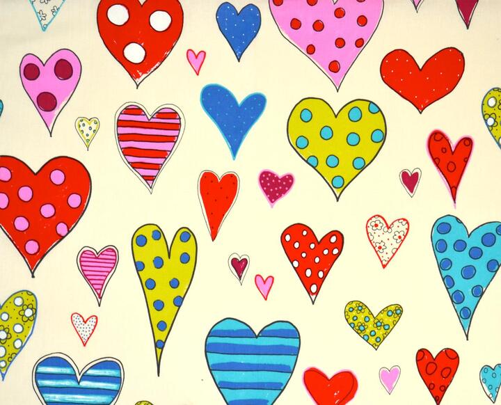 Kleurrijk hartjesgordijn met afwisselende motieven van strepen en stippen. Het Amor gordijn is beschikbaar in twee verschillende uitvoeringen en fleurt de meisjeskamer direct op.