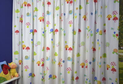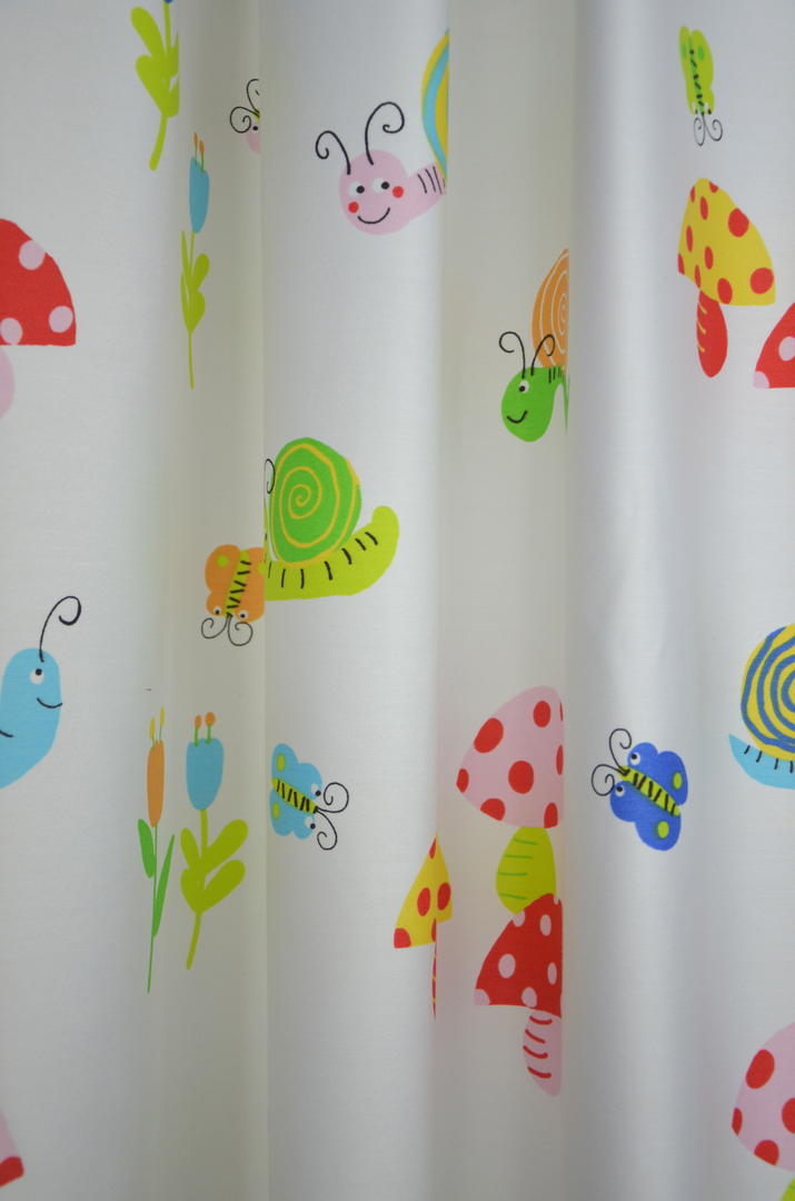 Kleurrijk kindergordijn met schattige illustraties van slakken, paddestoelen en vlinders. U kunt de gordijnstof door ons laten voeren tot een verduisterend gordijn. Vink deze optie aan in het bestelproces.