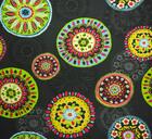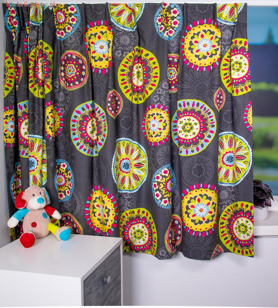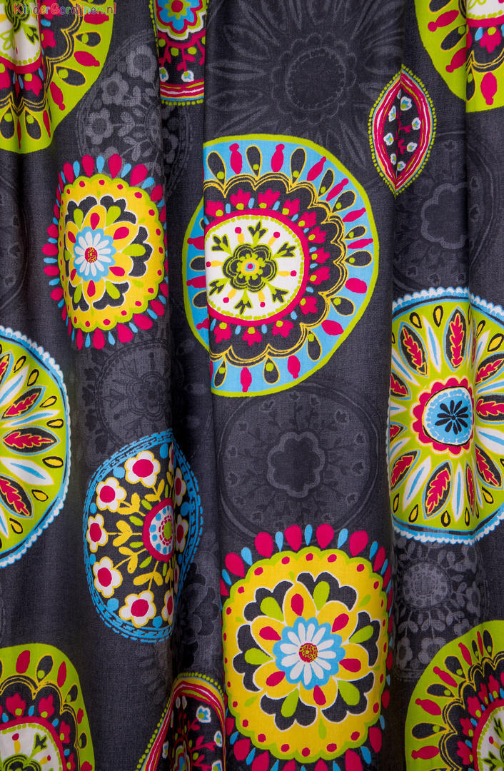 Dit is een bijzondere gordijn door de mix van verschillende woonstijlen. Er zijn Aziatische vormen in te ontdekken en tevens organische bloempatronen. Ook zie je door het contrast in kleur en dessin, een HIP RETRO gordijn. In beide gevallen uitstekend te combineren met een hout(look)wand, een lekkere plofbank en natuurlijk een rond kleedje. De stof is leverbaar in 2 kleuren. Het cirkelvormige patroon varieert van 12 tot 20 cm en is gedrukt op matte stof. Desgewenst verduisterend voeren.