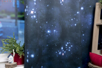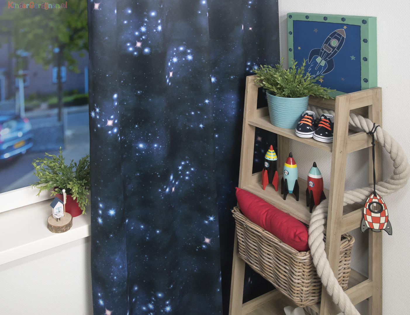 The sky is NOT the limit gewéldige kindergordijn! We gaan een stapje verder, naar de ruimte en onderzoeken het heelal. Wie zou niet in de voetsporen van André Kuipers willen treden? Deze Nederlandse ruimtevaarder heeft ervaren hoe het is om werkelijk te zweven. Met dit zgn. dim-out gordijn kan je met plezier wegdromen naar verre planeten en zonnestelsels. De stof is aan de voorzijde nachtblauw en maakt jouw kamer direct lekker donker zonder extra voering. De achterzijde is egaal gebroken wit, wat prettig is voor de warmte wering. Door het tijdloze sterrenthema op dit gordijn, kan jouw eigen astronaut héérlijk lang genieten van deze nachtelijke sterrenhemel. Ga je mee op deze ruimte reis?