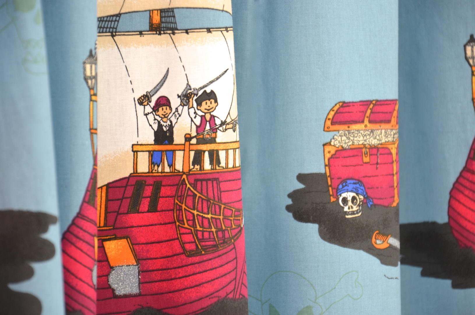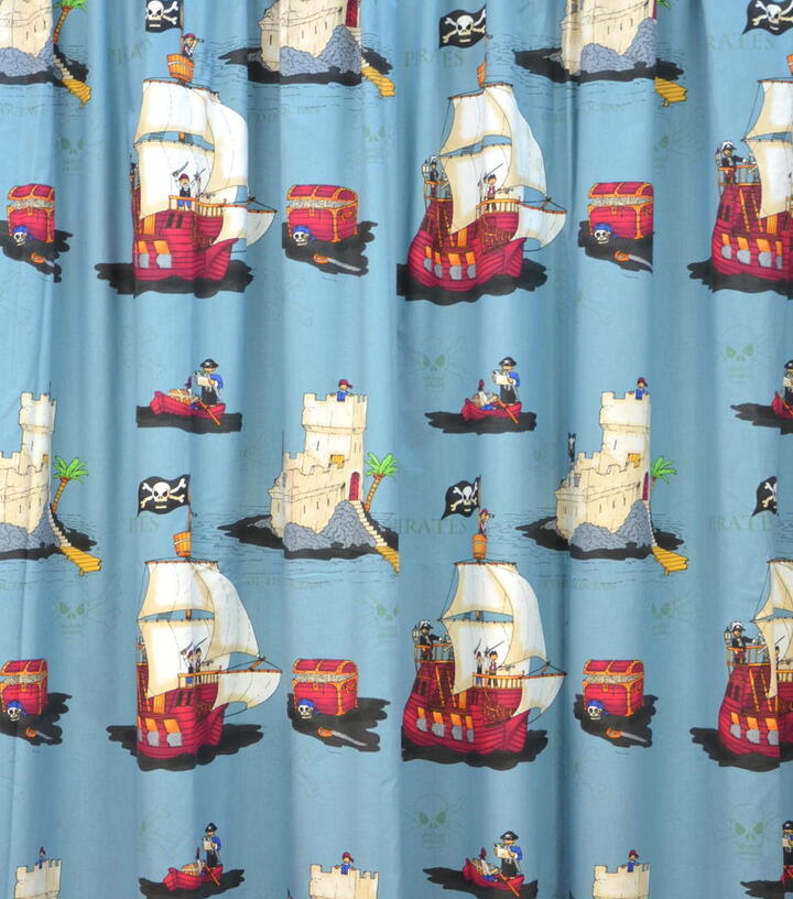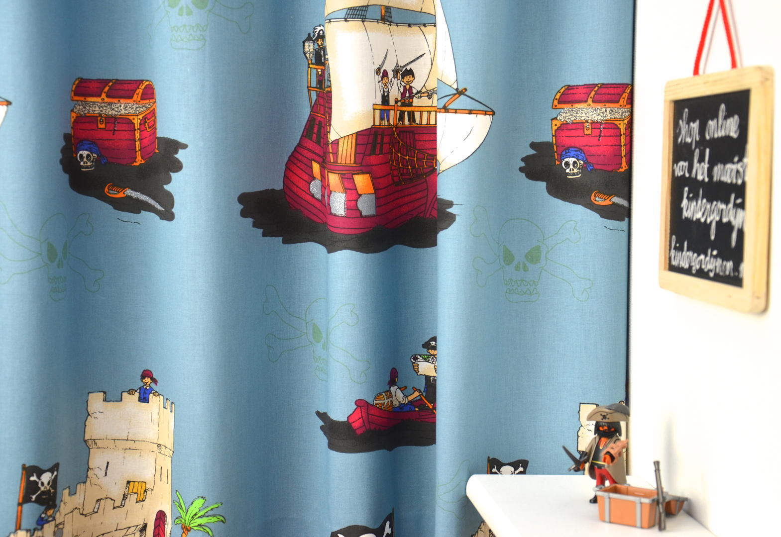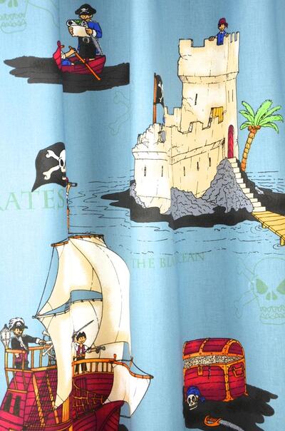 Avontuurlijk piratengordijn vol schepen, schatten en kastelen voor de kleine ontdekkingsreizigers. Verkrijgbaar in drie verschillende kleuren.