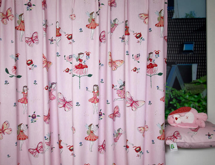 Roze gordijn met vlinders en vlindermeisjes naar ontwerp van Hanneke de Jager. Voor verduistering even laten voeren. De voering is eenvoudig aan te vinken in het bestelproces.
