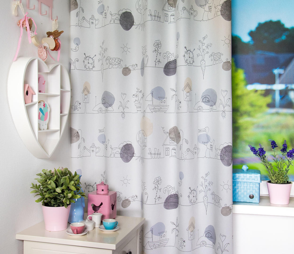 Gordijn in zachte pastelkleuren, luchtig & lieflijk! Pastel wordt veel gebruikt voor (jonge) kinderkamers omdat het zacht en vriendelijk overkomt. Wanneer je ‘de pastel’ méér power wilt geven, kan je een tint vanuit het gordijn als muurverf gebruiken. Daar creëer je een fraaie balans mee. De stof is dicht geweven, valt soepel en is door zijn samenstelling kleurecht. De tekeningetjes van het patroon zijn +/- 15 cm groot en gedrukt op de warm-witte ondergrond. Voor extra verduistering optie voeren even aanvinken.