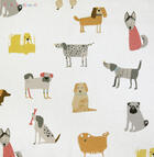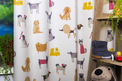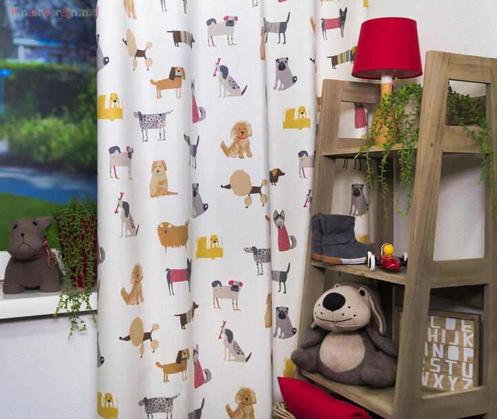 Wat een beestenboel, teckels, labradors, en dalmatiërs springen over de iets wat matte katoenen gordijnstof.