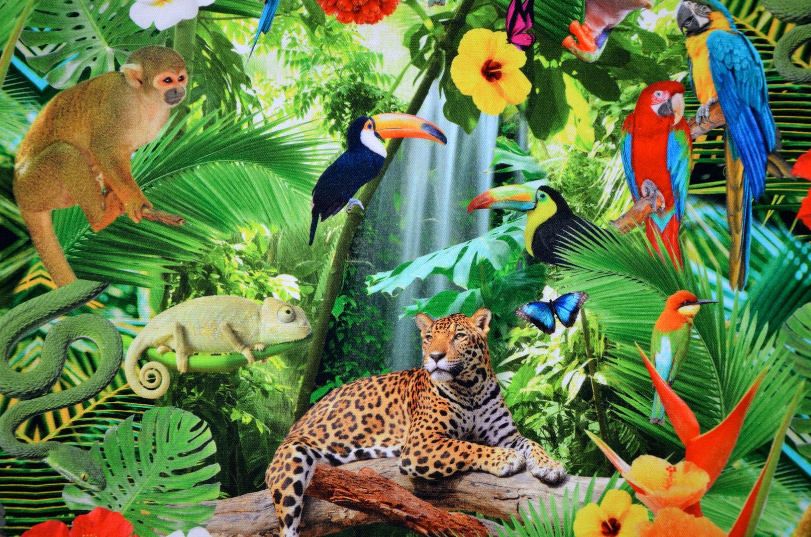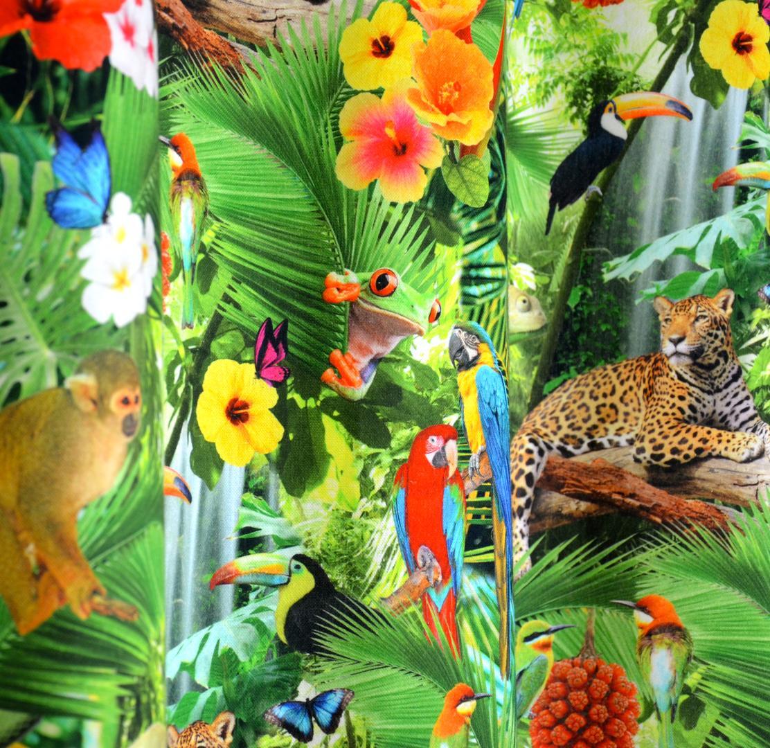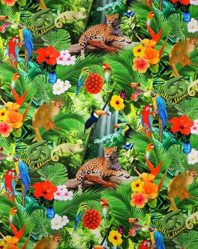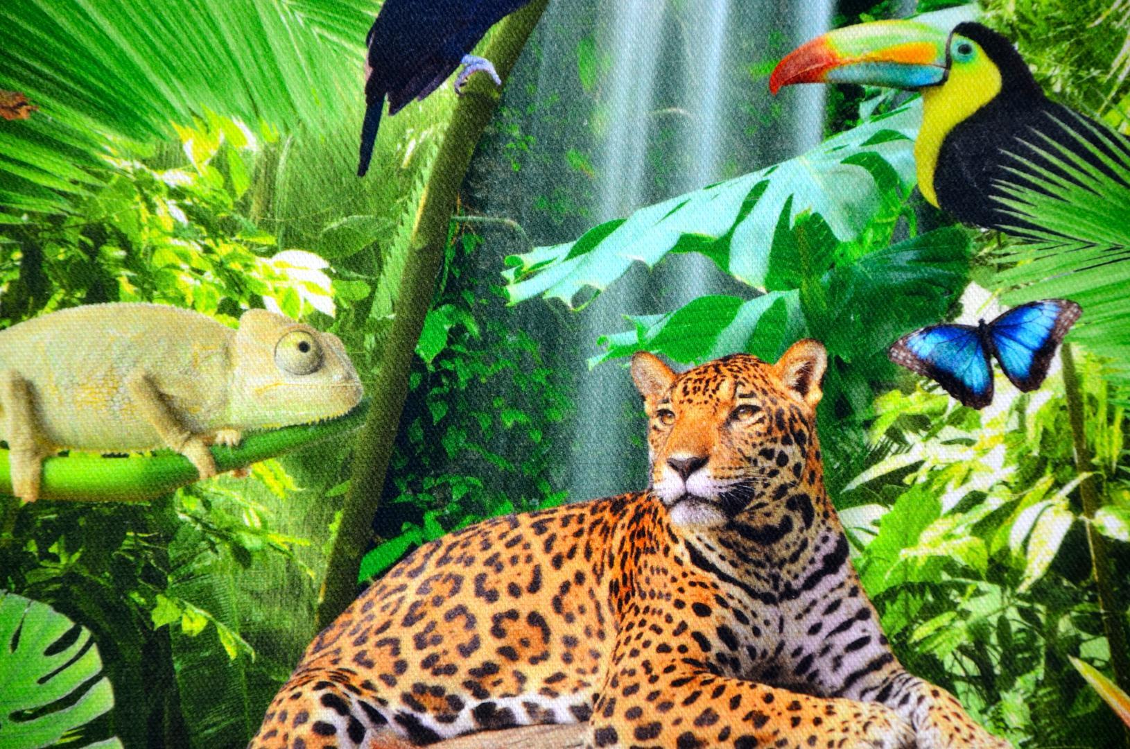 Fotografisch scherp staan alle dieren afgebeeld op dit gordijn. Haast niet te geloven, zó realistisch. Je krijgt een spannende JUNGLEKAMER! Zie je de kleurrijke ara? Hier 12 cm groot en de groene kameleon, die mag je zelf opzoeken. De digitale print is op de voorzijde van de stof gedrukt. Voor verduistering of extra kleurbehoud kan je het gordijn laten voeren. Welkom in het oerwoud, als je durft!